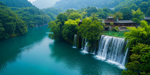 下午:游覽【陡坡塘瀑布】(游覽不少于1H),是黃果樹瀑布群中瀑頂最寬的瀑布,瀑布形成百米多長的鈣化灘壩上,在平水期,水流清澈,瀑布顯得十分清秀嫵媚,水層沿著和緩瀑面均勻的散開,在粼粼的鈣化灘面上輕盈的舞動,如一層薄薄的半透明的面紗,又如一面面張開的素絹扇面在陽光下泛著銀光。1986年版【西游記】片尾曲里面取景地。游覽結(jié)束后乘車前往酒店,入住酒店休息!
