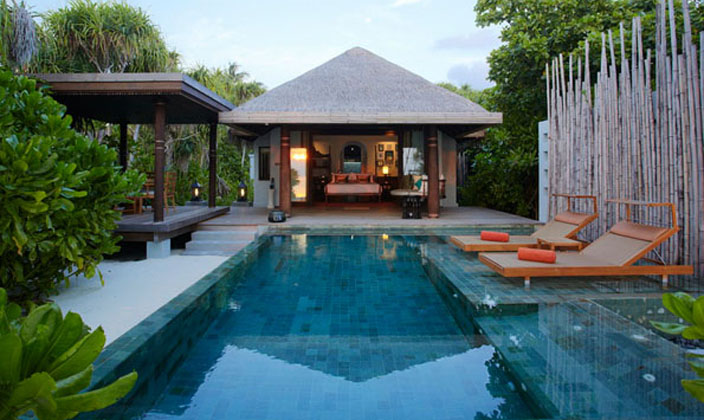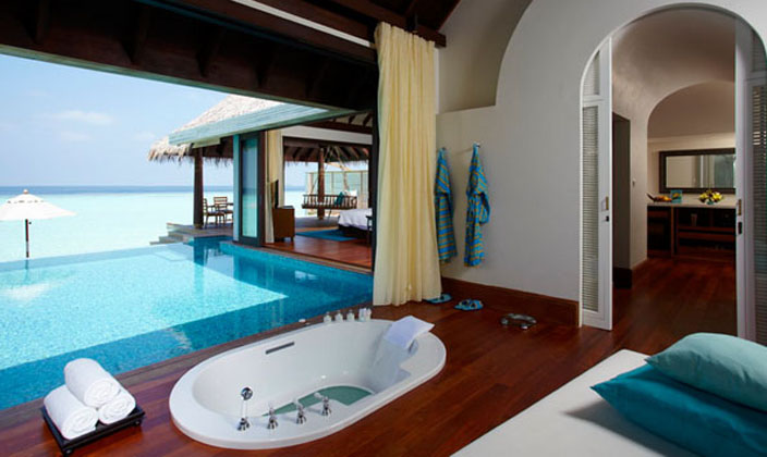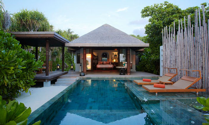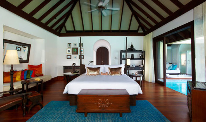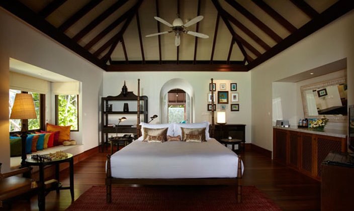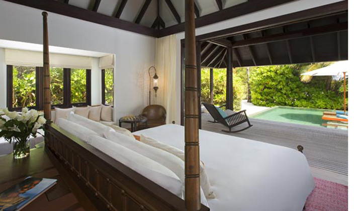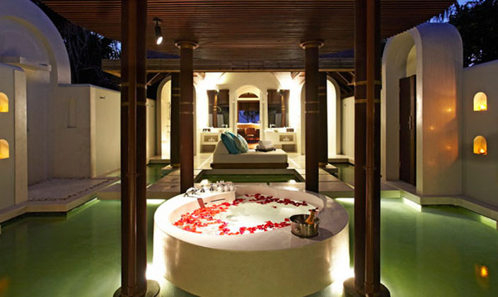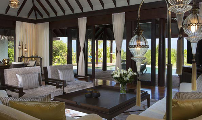 兩個主臥室別墅與中央別墅分隔而立,都擁有半露天浴室,沉入式浴缸周圍環繞著水塘、瀑布和戶外雨林式花灑。 第二棟宅邸擁有第三個主臥室,配有私家泳池和用餐亭、同樣寬敞的浴室和一個私家入口。每棟宅邸的客人共享大片的熱帶花園,以及按摩亭和設有水煙休息區的海灘小屋,更有私人管家24小時貼心服務。