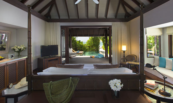 別墅主臥室擁有豪華的特大雙人床,浴室設有室內和戶外沐浴,以及嵌入淺水池中的露天浴缸。第二間臥室擁有兩張單人床和一張沙發床,相連的第二間浴室設有半室內和戶外淋浴。兩間臥室皆通往寬敞的日光甲板,一家人可以在躺椅上休憩,在四面敞開的用餐亭中共享美食,或是在延展至白色柔軟沙灘的大型無邊泳池玩耍。