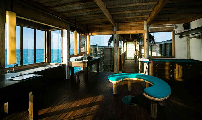 每棟克魯索居所單獨佇立在淺瀉湖中,私密度極高。客人惟有乘船方能到達這個水上居,可享受絕對的寧靜。別墅有獨立水上花園及戶外淋浴設施。起居廳寬敞、設有空調,透過玻璃地板,腳下礁湖中千姿百態(tài)的生物世界展現(xiàn)在眼前。