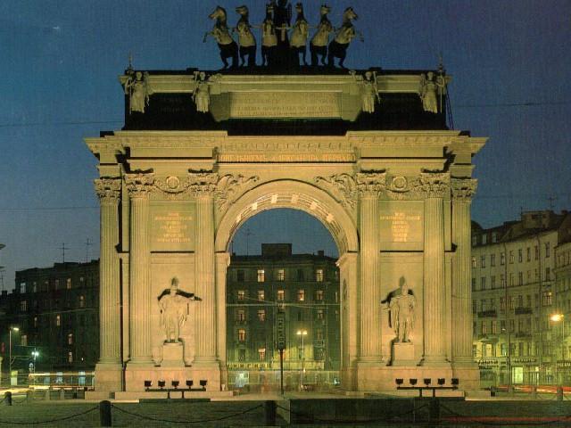 法國巴黎的凱旋門不相上下。因為是紀念同一場戰爭而修建的,是為紀念俄軍打敗拿破侖而建。門高28米,門頂是一尊手執月桂花環,背生雙翅驅駕六套馬車的勝利女神像。其下武士,手執利劍,或月桂花環和橄欖枝,象征勝利和平。門柱之間,四尊俄軍士兵,身披盔甲,手執盾槍,手指上刻著“驅逐法蘭西,解放