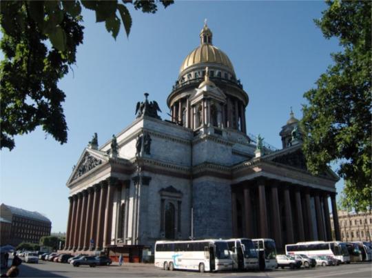 大教堂造型雄偉壯觀,建筑地基深達(dá)10米,外部共有112根整塊的深玫瑰色和斑環(huán)花崗巖圓柱,其中四面48根廊柱每個(gè)高17米,直徑2米,重達(dá)114噸,作為教堂的廊柱是全世界最大的。建筑四角豎有鐘樓,各帶一個(gè)相對較小的圓頂,它們與中央圓頂共同組成東正教教堂傳統(tǒng)的五圓頂。教堂四周各豎有16根粗大的花崗巖石柱,成雙排托起雕花山墻。整座建筑材料重達(dá)30萬噸,被視為俄羅斯晚期古典主義建筑的精華。