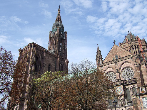 這是一座紅色的大教堂,據說是用從附近的孚日山脈采取的紅色砂巖石建成的。它是12—15世紀修建的哥特式教堂,便不由得使人聯想到以前所見過的,正面有兩座對稱尖塔的各地的大教堂。