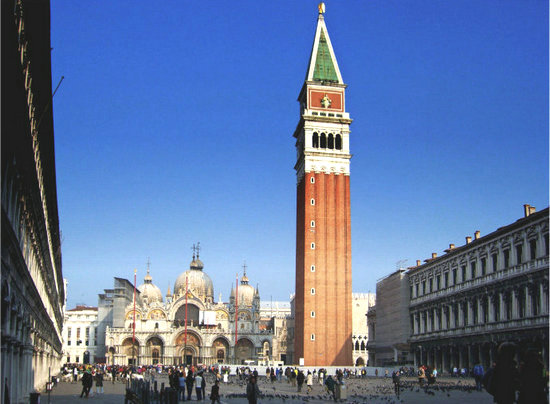 今日所見的鐘樓,取代了1902年倒塌的那座。登鐘樓頂層可俯瞰全城風(fēng)光。鐘樓頂部與背后的圣馬可大教堂(Basilica San Marco) 鐘樓下部——前廊于16世紀(jì)由珊索維諾興建,其古典風(fēng)格的雕塑,與共和國(guó)的光彩相輝映。