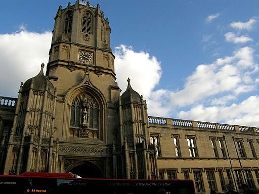 教堂前的尖塔叫做湯姆塔,建于1681年,塔中有一口被稱為“大湯姆(Great Tom)”的重達(dá)7噸的大鐘。每晚9點(diǎn)5分,這座大鐘都要連續(xù)敲響101次,因?yàn)閷W(xué)院設(shè)立之初有101學(xué)生,過去,學(xué)院的所有大門全部在最后一聲鐘響后關(guān)閉,回來(lái)晚的學(xué)生據(jù)說(shuō)還要被處以罰款。這一規(guī)定到1963年才被廢止。