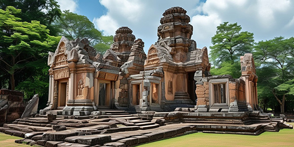 隨后前往古跡群中最久遠的【羅洛士群】(30分鐘),主要參觀【巴公寺】。【塔瑪農遺址】為12世紀初之建筑,現由中國專家負責維修,維修過程中依現行法令規定,后續所補上之石墩或石柱都不可有任何雕刻,以此作為與遺跡之區別。