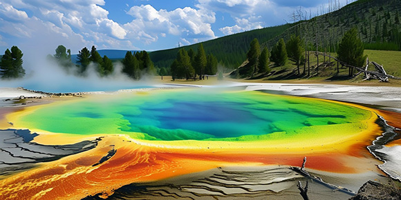 【大棱鏡彩泉】 (The Grand Prismatic Spring): 是美國最大,世界第三大的溫泉。它寬約 75 至 91 米, 49 米深,每分鐘大約會涌出2000 公升,溫度為71°C 左右的地下水。大棱鏡溫泉是黃石溫泉的杰出代表, 其直徑超過百米,從中心向外呈現(xiàn)出藍綠黃橙紅等不同的顏色, 是面積最大、色彩最美的一處景觀。