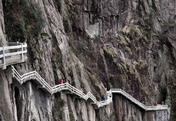 旅行社的導(dǎo)游楊小姐和司機(jī)、汽車(chē)到了,上車(chē)出發(fā)。一路上楊小姐把涇縣的物產(chǎn)、歷史一一道來(lái):涇縣特產(chǎn)有琴魚(yú),是以前的貢品,泡茶如活魚(yú)在水中游動(dòng),或做琴魚(yú)蒸蛋;茶葉,有愛(ài)民特尖,涌溪火青,汀溪蘭香等等;還有涇縣香菜,此香菜并非我們長(zhǎng)吃的香菜,而是指醬菜,在涇縣歷史上曾有一對(duì)兄弟,擅長(zhǎng)做醬菜,后來(lái)弟弟到了北京,開(kāi)了著名的醬菜園“六必居”,而哥哥則留在當(dāng)?shù)匕褯芸h醬菜的制作工藝發(fā)揚(yáng)光大。車(chē)在山中跑,我們又看到了兩天來(lái)長(zhǎng)長(zhǎng)看到的奇怪景象——在山坡上鋪著大片大片白色糊狀物,顏色有深有淺,楊小姐介紹這就是我們國(guó)家的國(guó)寶——宣紙的原材料,我們所見(jiàn)的白色東西是青檀樹(shù)皮加棉和石灰混合而成,鋪在山上要涼曬十八個(gè)月,隨著時(shí)間會(huì)越來(lái)越白;涇縣還有一個(gè)好吃的東東,是“萬(wàn)字糕”,甜而不膩,用打火機(jī)可以點(diǎn)燃。涇縣歷史上發(fā)生過(guò)一文一武兩件事,文的事件是唐代大詩(shī)人李白,于天寶十四年(775)游涇縣,留下了許多膾炙人口的詩(shī)篇,“涇川三百里,若耶羞見(jiàn)之……佳境千萬(wàn)曲,客行無(wú)歇時(shí)。”;武的事件就是1941年1月在涇縣茂林發(fā)生了震驚中外的“皖南事變”,現(xiàn)在涇縣云嶺的新四軍軍部舊址為全國(guó)重點(diǎn)文物保護(hù)單位,茂林地區(qū)的皖南事變烈士陵園是全國(guó)重點(diǎn)陵園,被列為全國(guó)愛(ài)國(guó)主義教育基地。