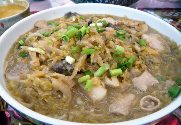 東北人那樣盤腿坐在火炕上,吃用大碗裝著的農(nóng)家菜,喝是