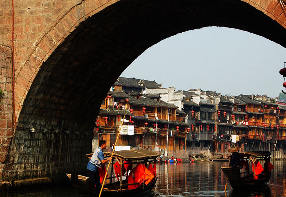 鳳凰古城有一條母親河,伴城而過,如黛似練,當地人呢修建起一種叫做吊腳樓的獨特建筑逐河而居。吊腳樓一側臨水,一側倚岸。臨水一側,以木支撐,是為“吊腳”。整棟小樓輕盈俊俏,樓臨水,水映樓,清晨黃昏,霞光如水水如煙,三五月圓之夜,景色更是怡人。這時鳳凰第一怪。有人問了,