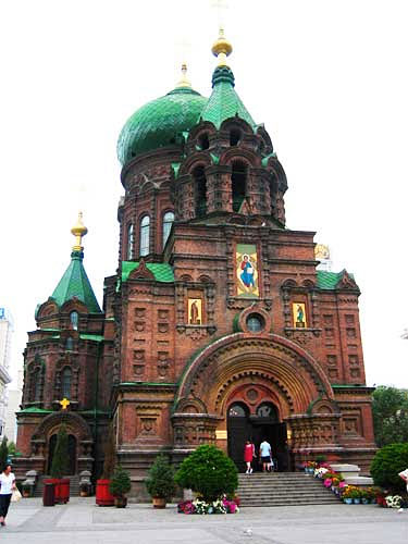 中央大街的盡頭是新陽(yáng)廣場(chǎng),從這里打的士到秋林公司只需起步價(jià),沿著秋林前面的果戈里大街(奮斗路)東行,在革新街(文革前稱(chēng)教堂街)與士課街交界處,你會(huì)看見(jiàn)一座外型保存完好的俄羅斯巴洛克式建筑,原來(lái)屬于東正教,名為圣·阿列克謝耶夫教堂,1980年轉(zhuǎn)給天主教教會(huì),現(xiàn)在名為圣·母無(wú)染原罪教堂。它體型復(fù)雜,墻面線(xiàn)角豐富,紅白相間,鐘樓為帳篷頂冠戴小穹頂,中廳用較大的洋蔥頭穹頂,屬于典型的巴洛克風(fēng)格,豪華中透露著浮夸。很多年輕人在這里舉行婚禮,站在神壇前,聽(tīng)牧師虔誠(chéng)的向主禱告幸福,在玫瑰花瓣浪漫的飛揚(yáng)中,在唱詩(shī)班天籟般的歌聲中,潔白的婚紗徐徐舞動(dòng)……在一個(gè)浪漫的地方,做一件浪漫的事,這本身就很浪漫。