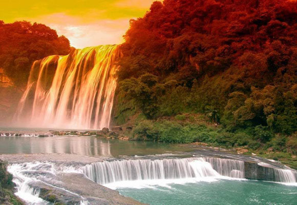 桂林之稱,走了很多路,過水中臺階,小山爬上爬行,行程中還有個天然形成的石橋,架在兩個山之間,最后坐索道到終點,很多景點也說不清楚,覺得整個景色就是一個天然的大盆景,而人都是縮小了,在盆景中走。到了12點多上車去黃果樹賓館吃中飯,其實黃果樹瀑布離這個景區比較近,吃過飯步行沒多久,終于到了我一直希望早點看到的黃果樹景區,坐了很長一段自動扶梯下山,接著走,看到瀑布了,換了不少角度拍了照,再上山穿過瀑布后面的水簾洞,身上都濕了,哈哈!聽說現在不是旅游旺季,應該是5月下旬到6月中旬這段時間瀑布的水流量最大。確實如此,感覺瀑布的水量比想象中的,或者說照片中看到的要小很多,聽導游說水量大的時候,在瀑布對面站著會有一種窒息的感覺(水霧太大)。