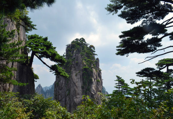 不記得纜車下的那站叫什么名字,只記得從那下了之后,就真的是爬著前進(jìn)了。這時(shí)候拐杖起到了作用,靠它支撐著爬,會(huì)比較輕松。黃山有很多的奇峰異石,特別松樹(shù),居然長(zhǎng)在石頭上的,沒(méi)有任何泥土的說(shuō),真是不可思議艾~將近中午的時(shí)候,我們到達(dá)了迎客松,游客已經(jīng)聚集了好多了,拍照,使勁的拍照,跟迎客松合影,呵呵~我和小三更是爬到了一塊懸崖的邊上,腿都已經(jīng)發(fā)軟了,還擺POSE拍照,后來(lái)想想還是蹲下比較安全,繼續(xù)拍,嘿嘿~