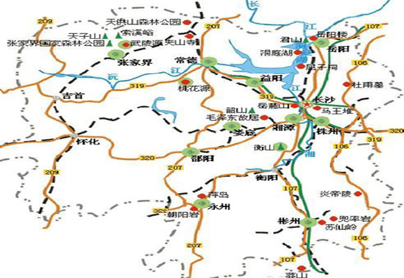 衡山,是著名的佛教圣地和避暑勝地。江南三大名樓之一的岳陽樓,以其悠久的歷史、美妙的傳說和雄偉的氣勢蜚聲中外。自然風景明珠武陵源風景區,地貌奇特,古木參天,奇峰怪石錯落相間。