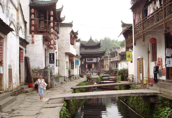 客棧比比皆是。置身小樓,一把竹椅,下面是透明的竹海和夕陽中的茶樓。這樣的環境我一下子喜歡上了,就在這個叫做“雙塘”的客棧住下來。叫雙塘是因為院子里有兩個水塘,里面游動著好多大紅鯉魚和青色的草魚,草魚。這里荷包紅鯉魚是出了名的佳肴。那草魚大得很,店主說大的有十幾斤重,都是自己養的。淡季房價很便宜。老板一家人非常好,我經常和店老板一起聊天,他們夫妻兩個年輕的時候出去打工,40幾歲回家建房子開了這個店。老板娘勤快得很,白天在門前擺個小攤。天氣好的時候總是把床單被子拿到晾臺上去曬,讓你睡覺的時候雪白的床單能夠聞到陽光的味道。因為我是一個人,他們就叫我和他們一家人一起吃飯,這樣可以吃幾個菜。早晨還可以喝到老板娘用大棗、紅豆、大米煮的粥。走的時候,老板用摩托車載著我到村口公路上等車的地方。好人是愉快旅途的一道風景。典型的徽派建筑,雋秀的線條,歲月和江南濕氣涂抹的粉墻黛瓦,水墨畫的境界,這樣的風景在這里是無處不在的