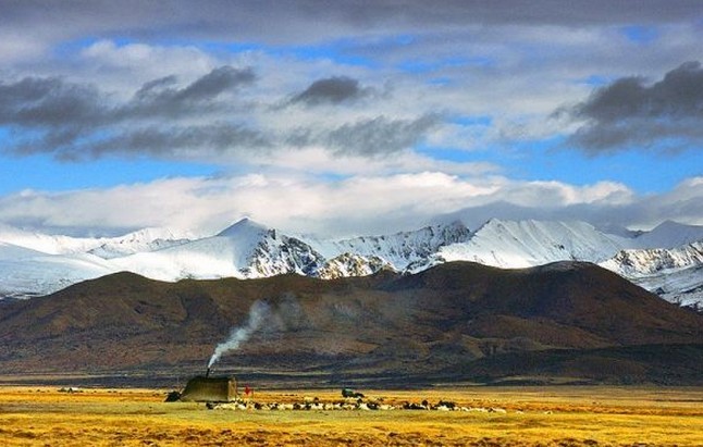 黛色的天空下面如鏡的水,水之上又是彩色的田野、樹林和人群。婦人帶著孩子在水邊洗澡玩耍,恬靜的曠野里散發出一種芬芳的氣息。遠處的山和繁茂的林子, 夏天還是一片青色,現在被染成金黃或是紫紅。在秋風中,西藏竟然是這樣千嬌百媚。 氣溫由炎熱變涼爽,草色由綠轉黃,天高云淡,秋高氣爽。這是一年內的收獲季節,不僅僅收獲果實,而且收獲一年中最艷麗的旅行色彩。