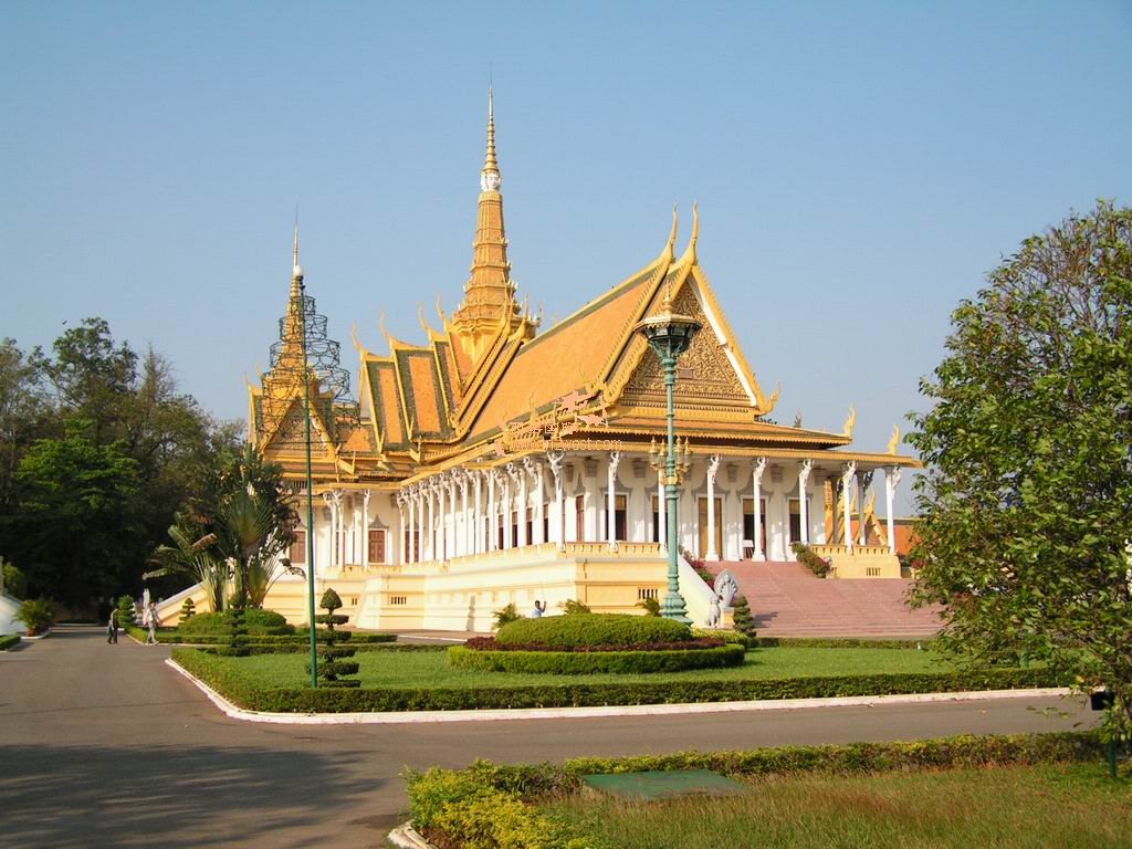 金邊最主要的建筑群就是這建于19世紀(jì)中葉,位于洞里薩河畔的大皇宮。柬埔寨現(xiàn)任國(guó)王西哈莫尼的私宅也在其中,只是單獨(dú)用圍墻包圍起來(lái)而已,游人們可以在遠(yuǎn)處對(duì)其指指點(diǎn)點(diǎn)。在洞里薩河上,看藍(lán)天白云下的皇宮大屋檐與一座座尖塔是那么的金碧輝煌,夜晚從河面上看向那些宮殿的剪影,會(huì)顯得很神秘。